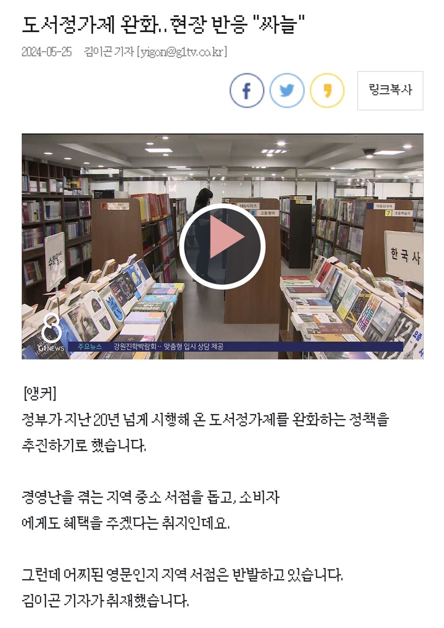 아무도 몰랐던 도서정가제 근황 상두야2차가자 0 2024.06.08 15:00 도서정가제가 올해 3월 완화 되었음 응? 이라고 할텐데 지역 서점 대상으로 할인폭 제한을 일부 풀어줬다고 함 막상 지역 서점들 말로는 이미 도서정가제 가격으로 시장이 형성 되어 있어서 마음대로 내리지도 못하고 있고 그냥 서점들끼리 출혈 경쟁하는 형태가 되어버려서 그 누구도 이걸 만족해하지 않는다고 함 사실 상 아무 의미 없는 정책 완화 상태라고