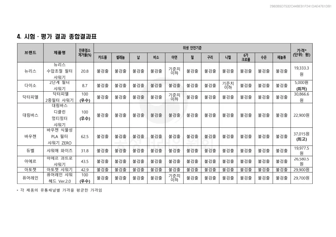 샤워기 필터 제조사별 잔류염소 제거율
