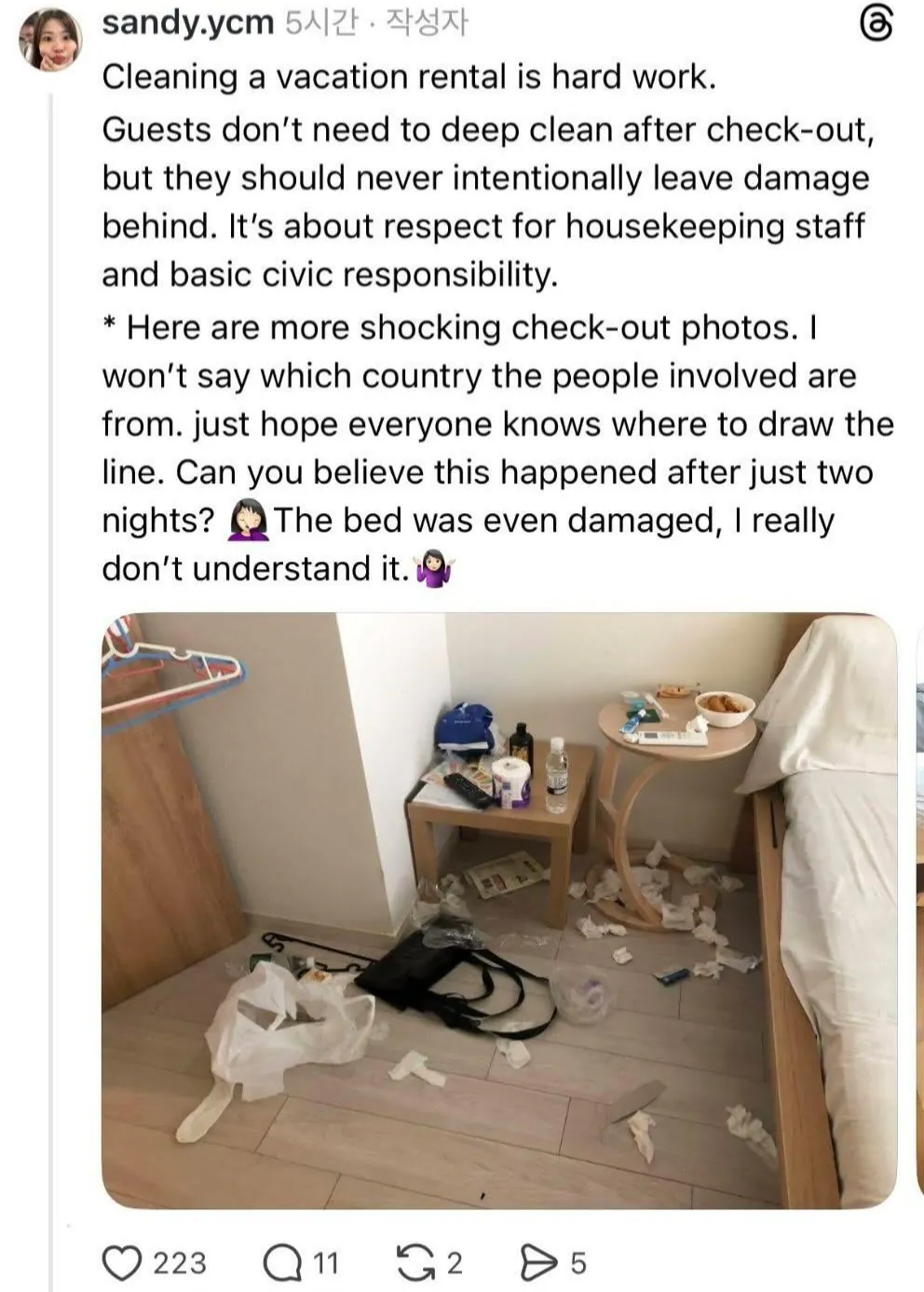 숙박객들이 방을 개판 쳐놓은 걸 가지고