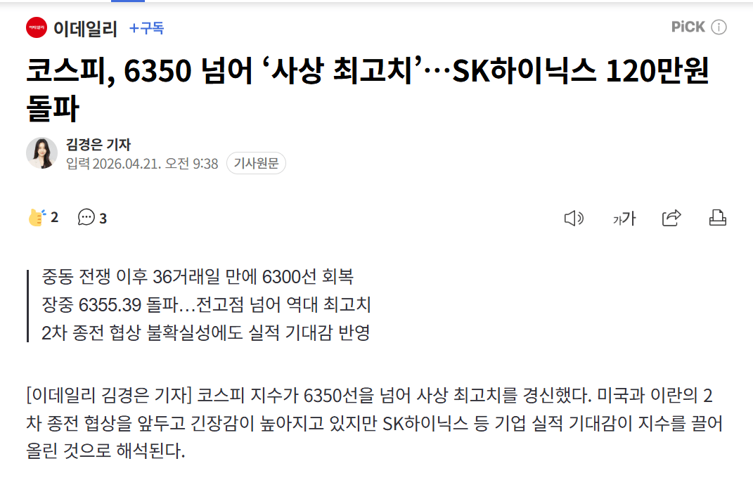 코스피 전고점, 하이닉스 120만닉스 돌파 ㄷㄷㄷㄷㄷ