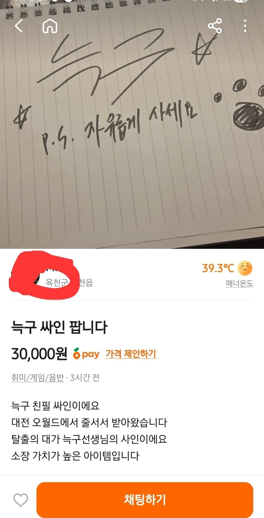 당근마켓에 올라온 늑구 친필 싸인 가격